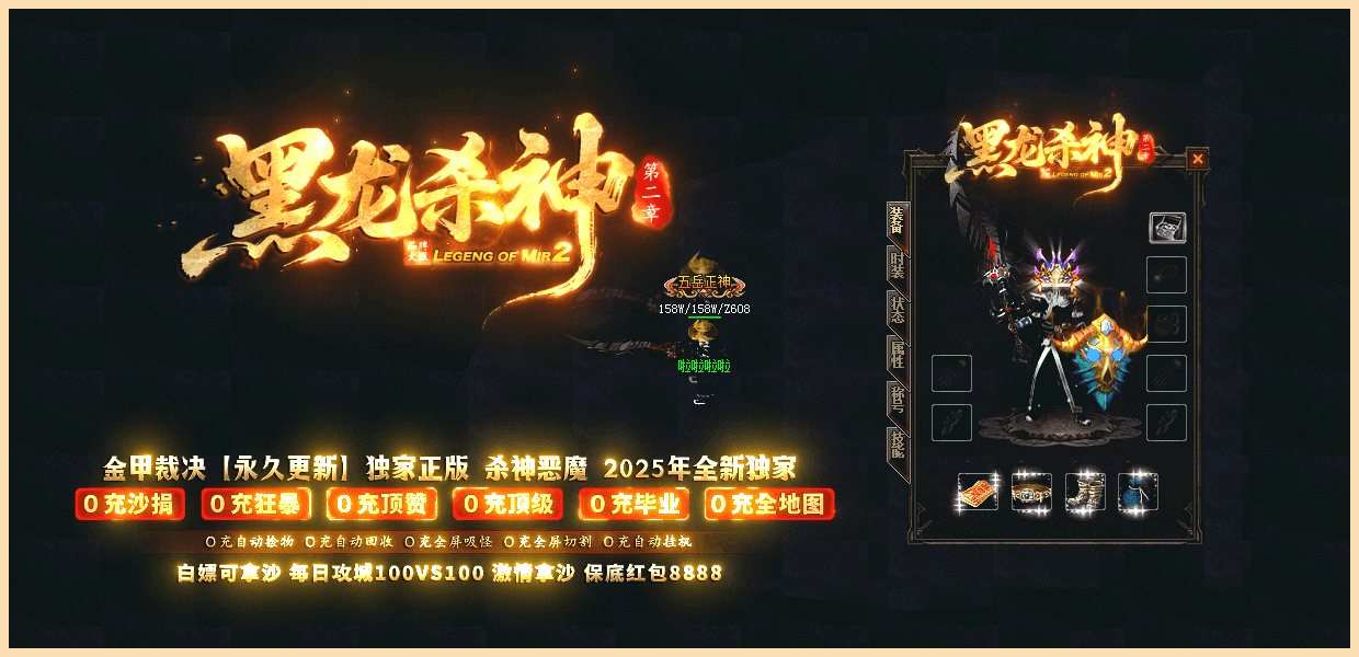 ★黑龙杀神★:已经稳定开放半年,10倍充值,百倍爆率,千倍激情,万人拿沙,所有装备靠打,白嫖永远不死!
